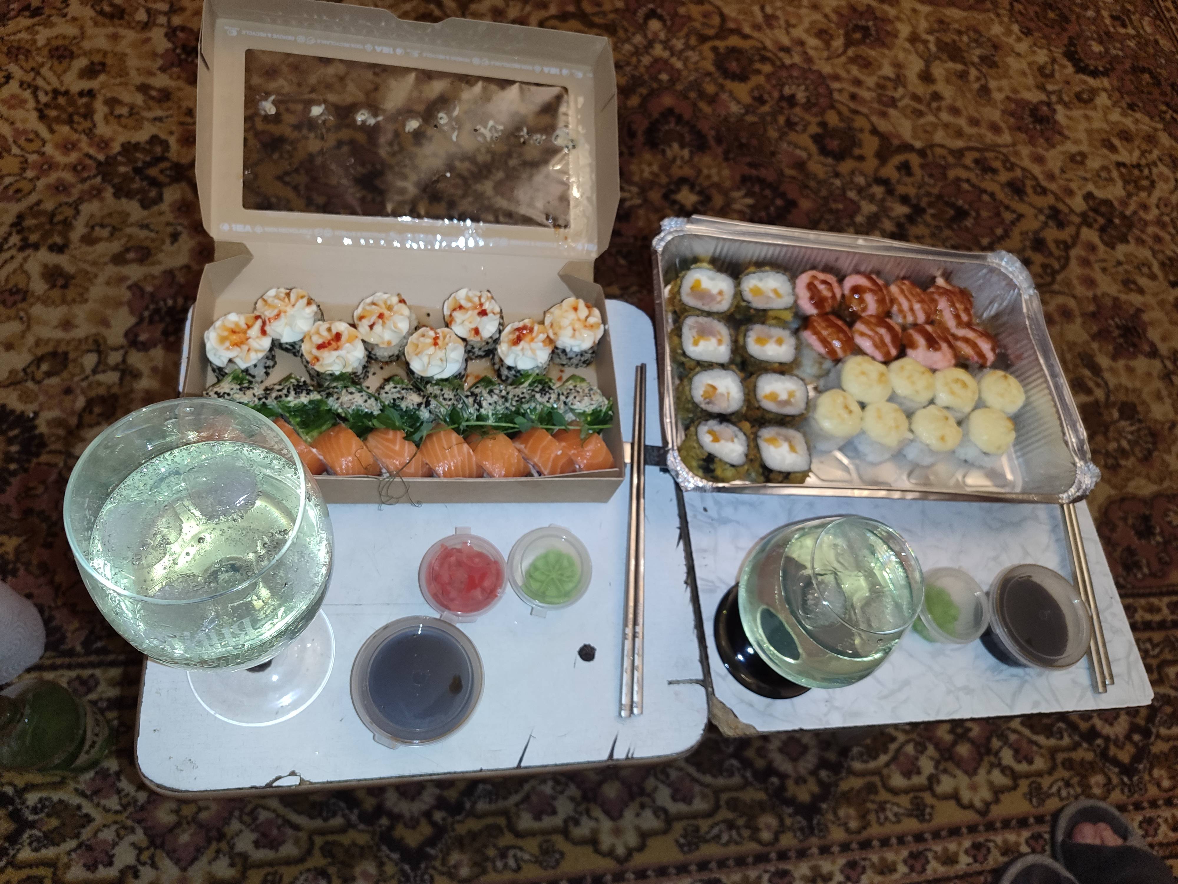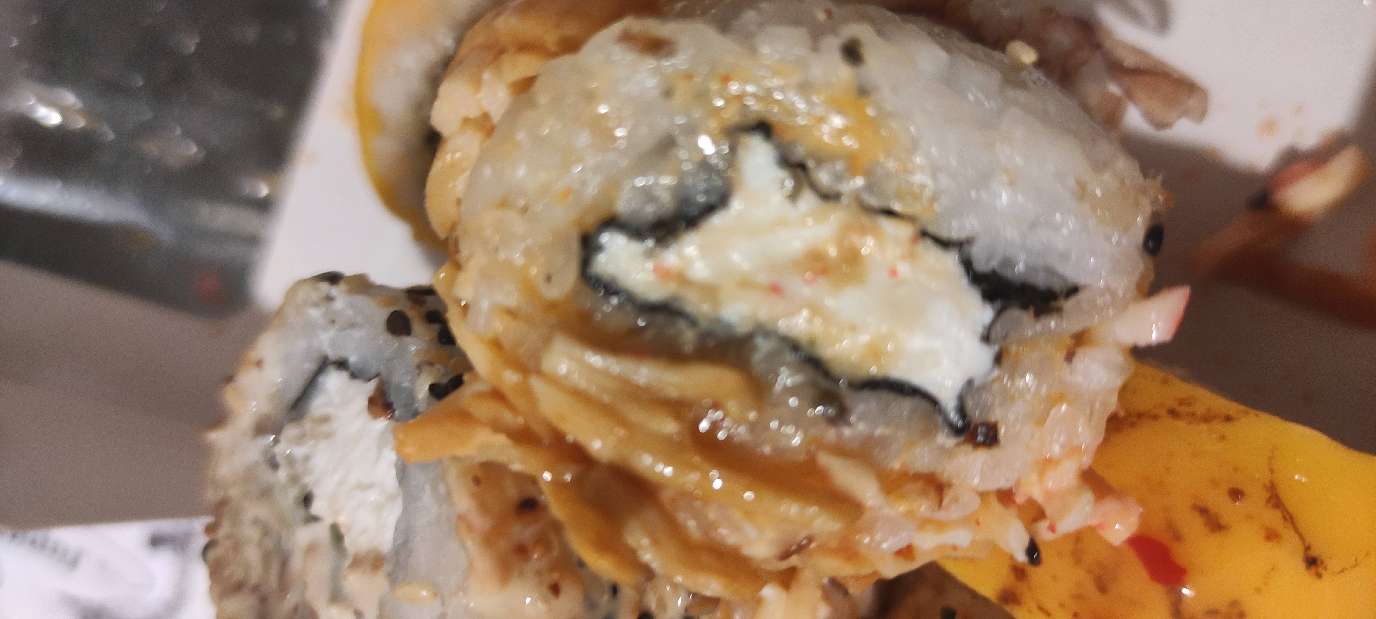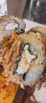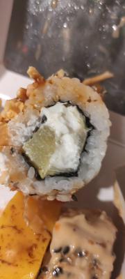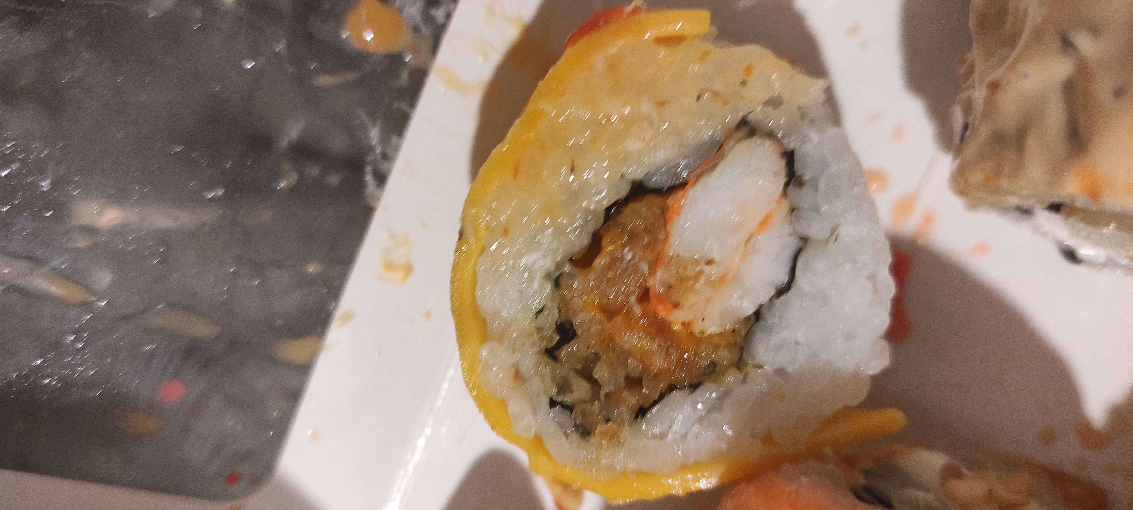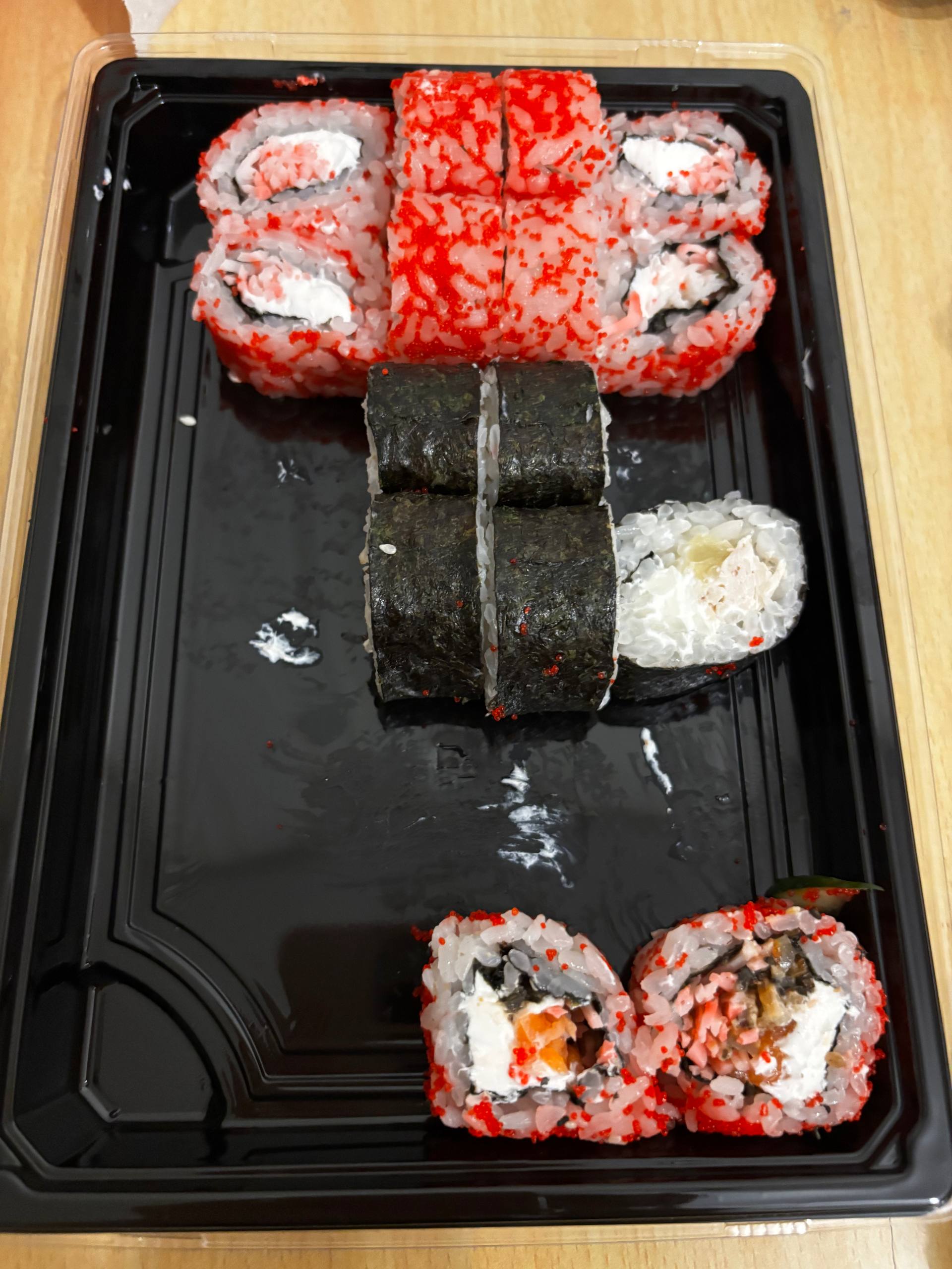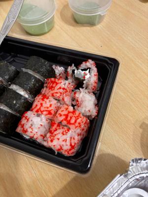 Суши не понравились, привезли все помятые. Там где попадался авокадо, как камень.