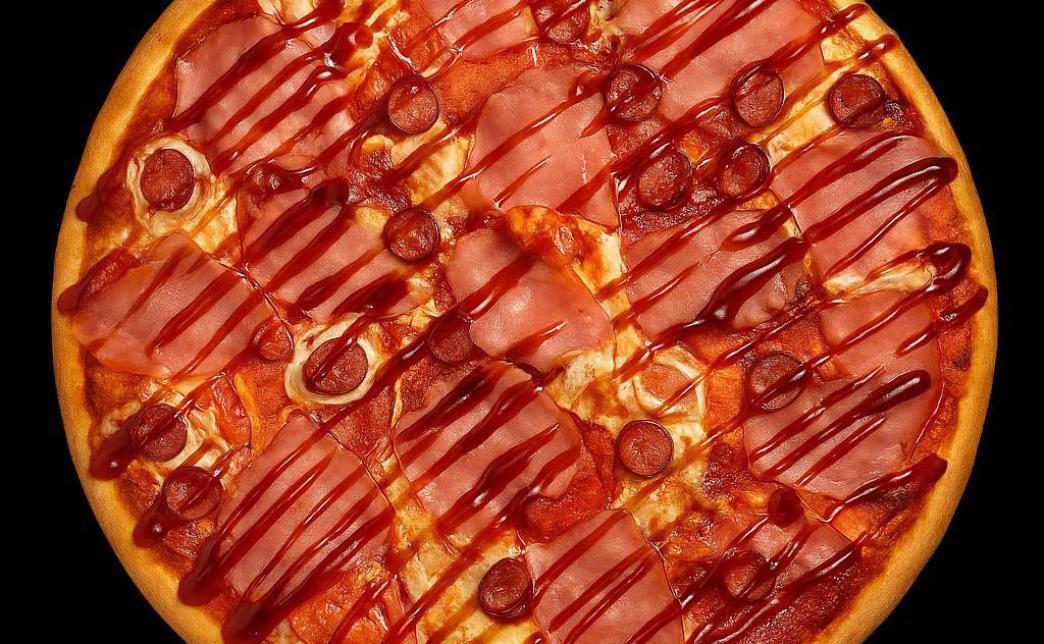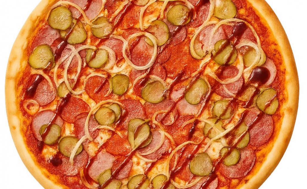 Состав: пицца-соус, моцарелла, прошутто, бекон, колбаски охотничьи, пепперони, соус "Барбекю", лук