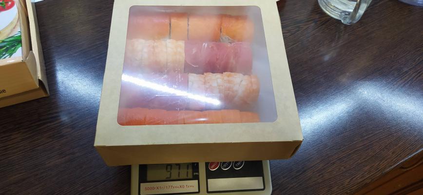 Недовес больше чем 140 г, т.к взвешивали в упаковке. Заявленный вес 1110 г. А так суши вкусные.