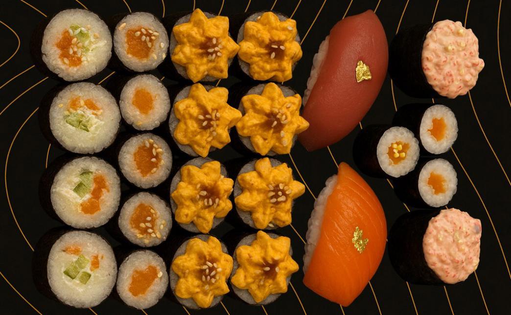 Состав: нигири с лососем, нигири с тунцом, ролл с кальмаром и икорной шапочкой, маки с лососем и огурцом mini, хосомаки с лососем, гункан с лососем, гункан с тунцом, комплект соусов.