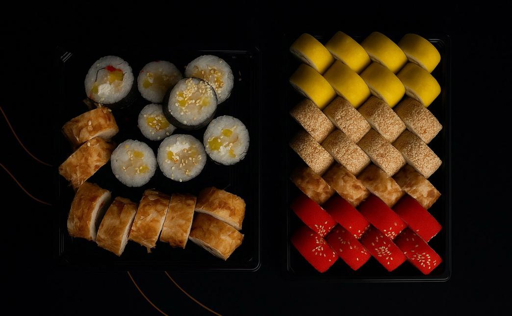 Состав: ролл "Калифорния с крабом", ролл филадельфия "Такуан", мак с кальмаром, бонито с тунцом, комплект соусов